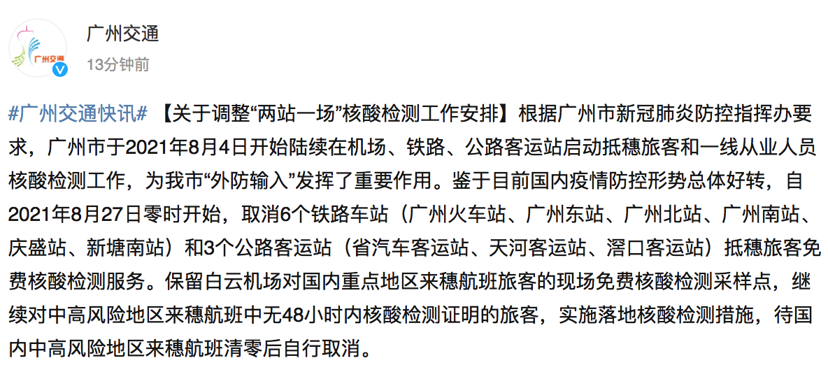 鉴于目前国内疫情防控形势总体好转,自2021年8月27日零时开始,取消6个铁路车站(广州火车站、广州东站、广州北站、广州南站、庆盛站、新塘南站)和3个公路客运站(省汽车客运站、天河客运站、滘口客运站)抵穗旅客免费核酸检测服务。