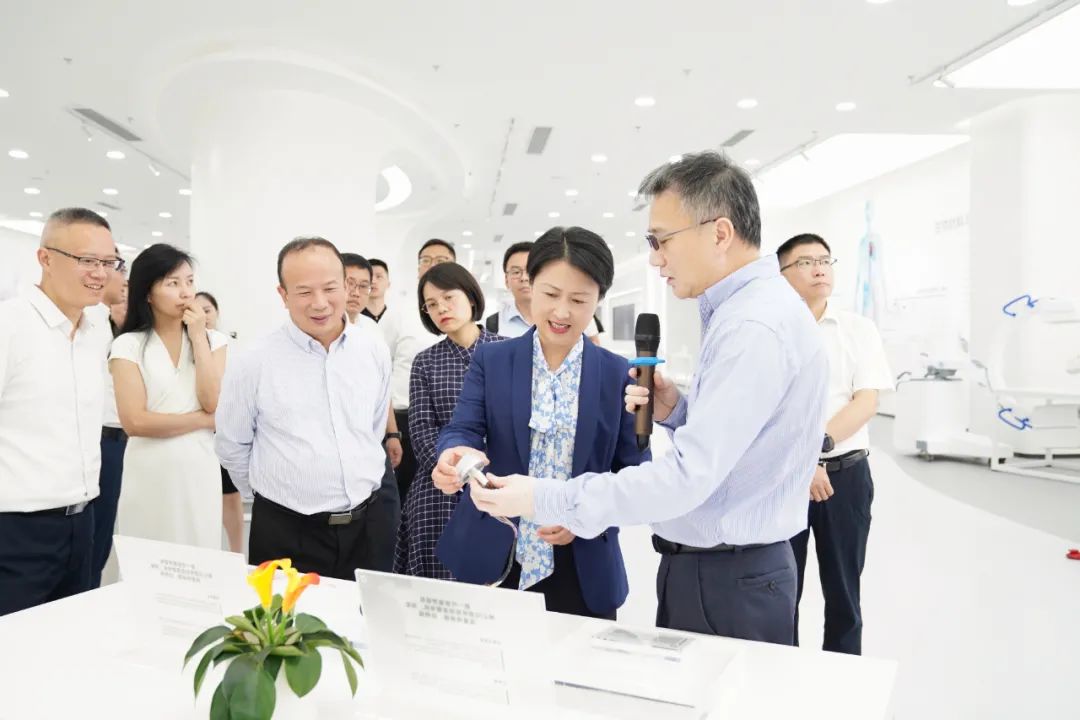在国家高性能医疗器械创新中心,季晶一行参观了创新中心展厅,学习该中心在平台建设、创新体系与转化机制等方面的好经验、好做法,了解前沿医疗器械的应用领域和发展前景等。