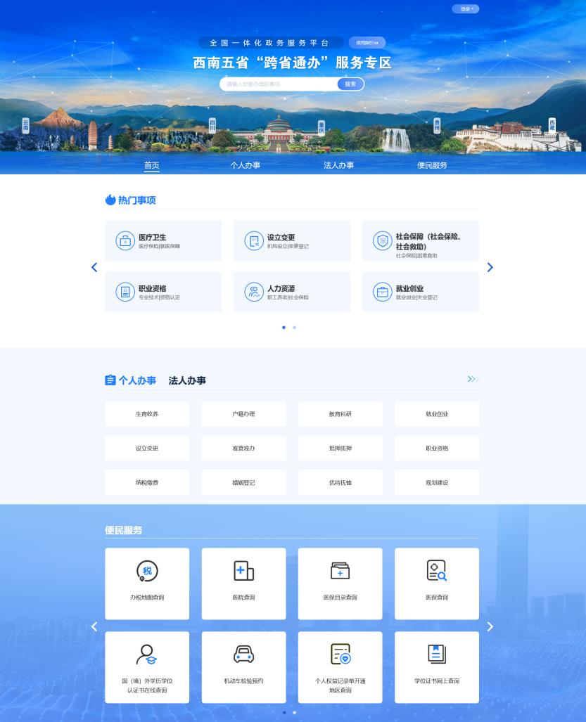 近日,由云南省牵头,重庆、四川、贵州、云南、西藏联袂打造的西南五省区“跨省通办”服务专区上线,为企业、群众提供更加便利的异地办事服务。新上线的西南五省区“跨省通办”服务专区聚焦企业、群众异地办事过程中的难点和堵点,初步实现通办事项“收、分、转、汇、查”,区域内线上服务自动分发、流转,线下异地代收代办。目前,第一批西南五省区“跨省通办”事项清单已发布,包含国务院要求实现通办的128项服务和20项区域特色服务,涉及民政、税务、交通等17个部门,涵盖户籍迁移、医保社保、住房公积金办理、道路运输等高频服务事项。