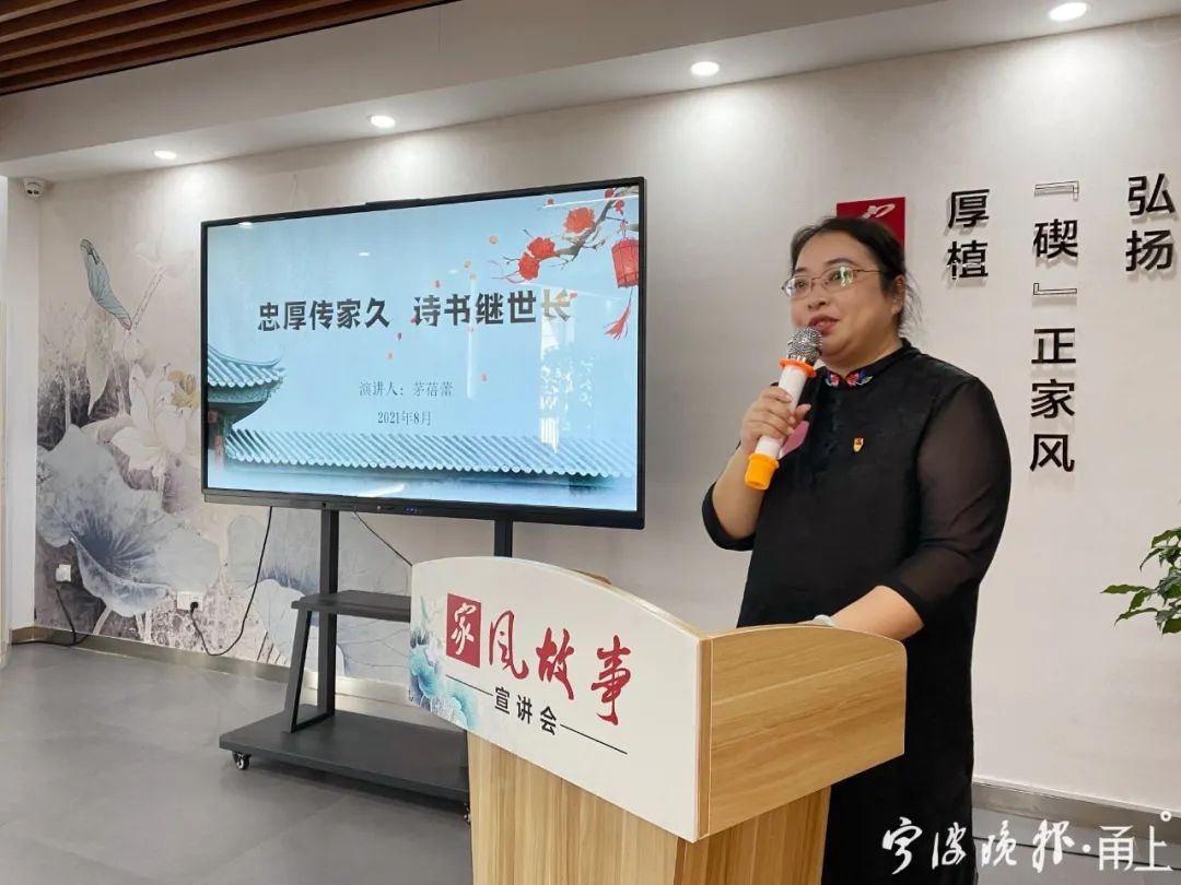 “我们家族世代崇尚读书,以传道、授业和解惑为荣。” “家风如春雨,润物细无声。有循循善诱的指引、以身作则的示范,也有严厉鞭策和督促。”……8月27日下午,一场特殊的分享会在宁波北仑新碶街道党群服务中心举行。来自该街道的12户家庭代表依次登台,“晒”出各自的家风。