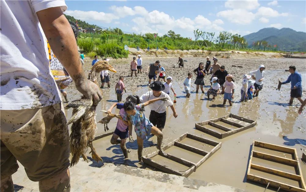 泥中作乐,拥抱自然。随着裁判一声哨响,海马速滑接力赛拉开了活动序幕,场下选手在泥潭中奋力滑行,场边加油声此起彼伏,随后的赶海渔家、徒手捕鸭等项目更是掀起了一场全员滩涂狂欢。灿烂的阳光混杂着汗水、海土和大海的味道,每个人脸上都洋溢着热情的笑容。